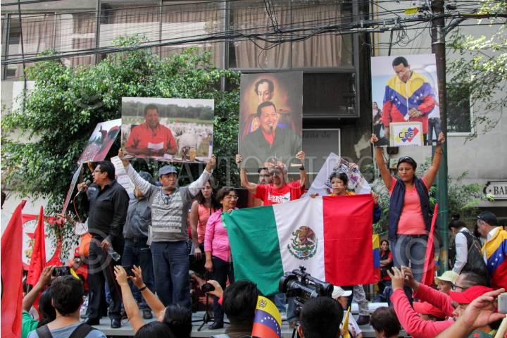 CIUDAD DE MÉXICO, 30JULIO2017.- Decenas de venezolanos residentes en la capital del país salieron a manifestarse frente a la embajada de su país, así como frente el altar a los Niños Héroes para declararse en contra de la Constituyente, propuesta por el presidente Nicolás Maduro. Los inconformes pidieron al pueblo mexicano unirse para luchar en contra de la dictadura que viven en su país y por una Venezuela libre. En la imagen, integrantes del Frente Popular Francisco Villa y del Movimiento Social por la Tierra se manifestaron en pro de la Constituyente frente a la embajada. FOTO: GALO CAÑAS /CUARTOSCURO.COM
