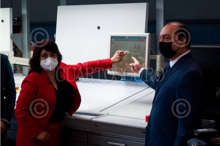 Patricia Avendaño Durán y Abraham Ezequiel Zurita durante el inicio de impresión de boletas para la Consulta de Presupuesto Participativo 2022 en los Talleres Gráficos de México.