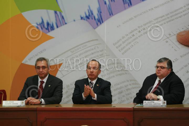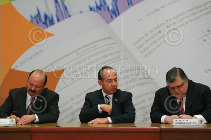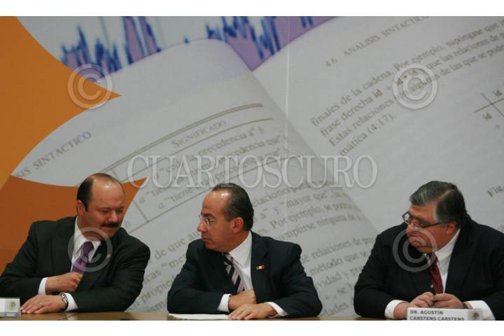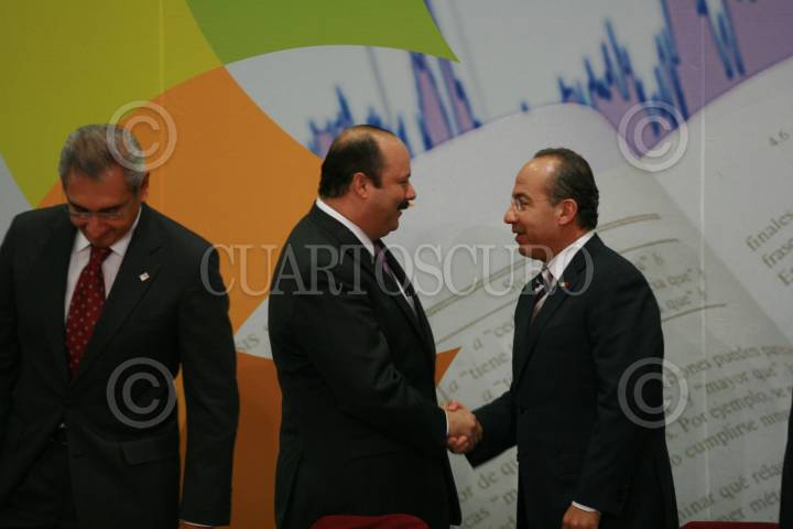 MÉXICO, D.F., 27ENERO2009.- César Horacio Duarte Jáquez Presidente de la Mesa Directiva de la Cámara de Diputados, Felipe Calderon Hinojosa Presidente de México acompañado por el Secretario de Hacienda Agustín Carstens Instalación del Consejo Nacional de Armonización Contable SHCP, realizada en el salon Adolfo Lopez Mateos de la Residencia Oficial de los Pinos. FOTO: SÁSHENKA GUTIÉRREZ/CUARTOSCURO.COM