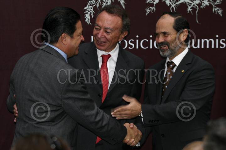 MÉXICO D.F., 25SEPTIEMBRE2008.- El gobernador del Banco de México Guillermo Ortiz, y los senadores Manlio Favio Beltrones y Gustavo Madero durante una firma de convenio en la inauguración de la exposición Memoria Contante y Sonante: Exposición Numismática que se realizo en el Senado de la República. FOTO: RODOLFO ANGULO/CUARTOSCURO.COM