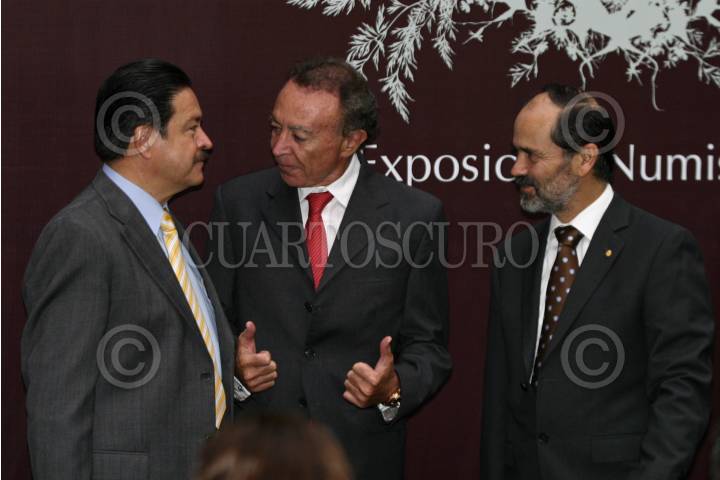 MÉXICO D.F., 25SEPTIEMBRE2008.- El senador Carlos Navarrete, el gobernador del Banco de México Guillermo Ortiz y el senador Gustavo Madero momentos antes del evento donde se inauguro la exposición Memoria Contante y Sonante: Exposición Numismática que se realizo en el Senado de la República. FOTO: RODOLFO ANGULO/CUARTOSCURO.COM