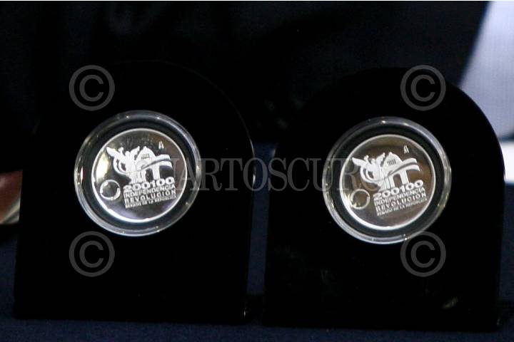MÉXICO D.F., 25SEPTIEMBRE2008.- Moneda conmemorativa por el Bicentenario y Centenario de la Independencia y Revolución que se presento en la inauguración de la exposición Memoria Contante y Sonante: Exposición Numismática que se realizo en el Senado de la República. FOTO: RODOLFO ANGULO/CUARTOSCURO.COM