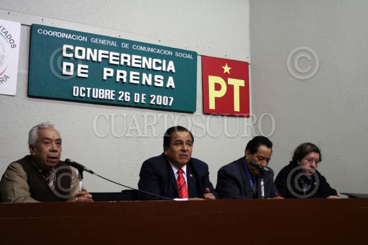 MÉXICO D.F. 26OCTUBRE2007.-El Diputado del PT, Joaquin Vela, durante su conferencia de prensa, donde hablo de la reforma fiscal.En la imagen es acompañado por José Luis Vega, del Frente Sidical Mexicano, José Ramírez Vaca y Alberto Vargas Lucio, del Movimiento 17 de Marzo del Pequeño Contribuyente. FOTO: GUILLERMO PEREA/CUARTOSCURO.COM