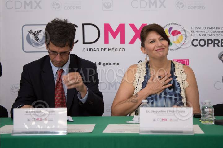CIUDAD DE MÉXICO, 15ABRIL2016.- Iván Pérez, Director de Cultura por la No Discriminación; Christopher Gascón, Representante en México de la Organización Internacional para las Migraciones (OIM); Jacqueline L´ Hoist Tapia, Presidenta del Consejo para Prevenir y Eliminar la Discriminación de la Ciudad de México; y Mariana Olivera West, Directora General Adjunta de Política Internacional Sobre Derechos Humanos de esta Cancillería, encabezaron una firma de convenio para colaborar en contra de la xenofobia en la capital. FOTO: TERCERO DÍAZ /CUARTOSCURO.COM
