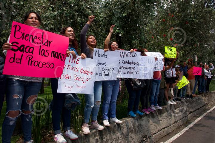Simpatizantes de Marcelo Ebrard a las afueras del INE en Tlalpan.