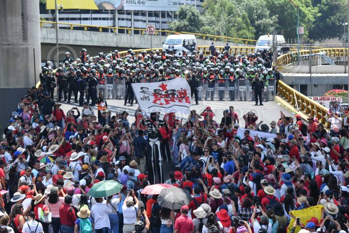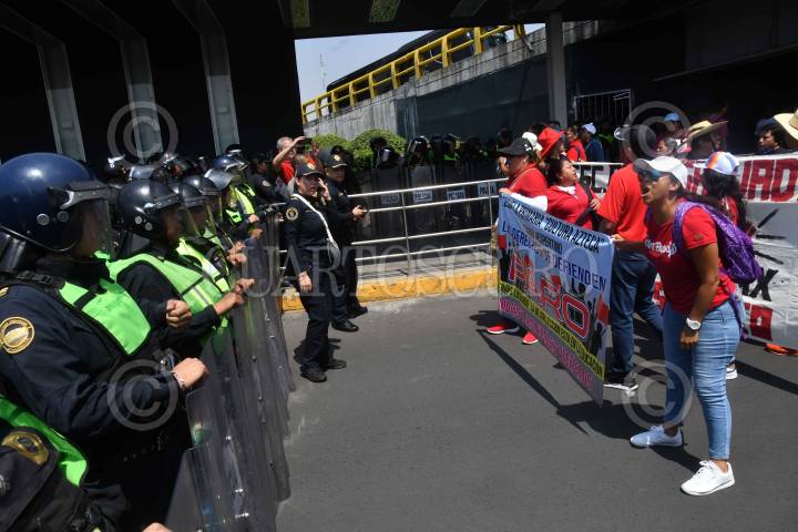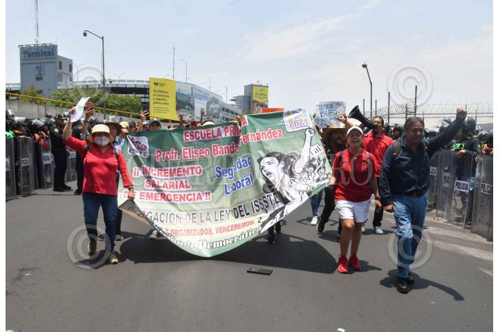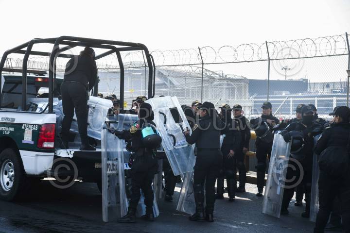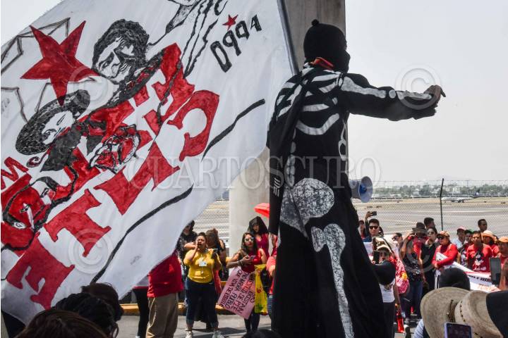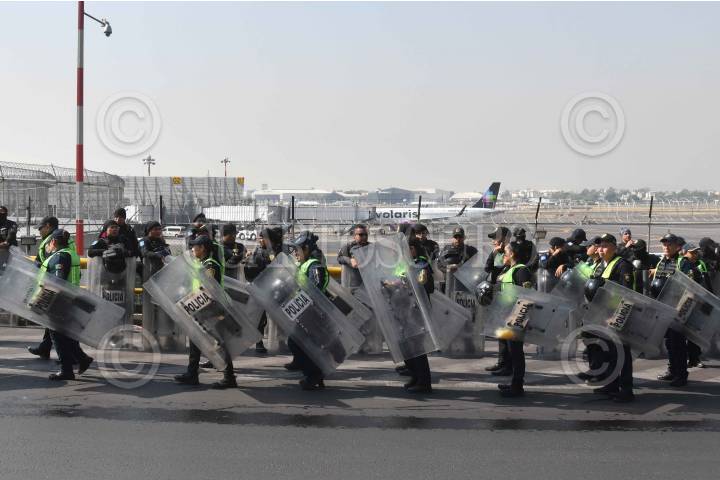 CIUDAD DE MÉXICO, 24MAYO2024.- Maestros de la Coordinadora Nacional de Trabajadores de la Educación (CNTE) realizaron una manifestación en la inmediaciones de la Terminal 1 del Aeropuerto Internacional de la Ciudad de México (AICM) en exigencia de un aumento salarial. El lugar fue resguardado por elementos de la Secretaria de Seguridad Ciudadana (SSC). FOTO: MARIO JASSO/CUARTOSCURO.COM