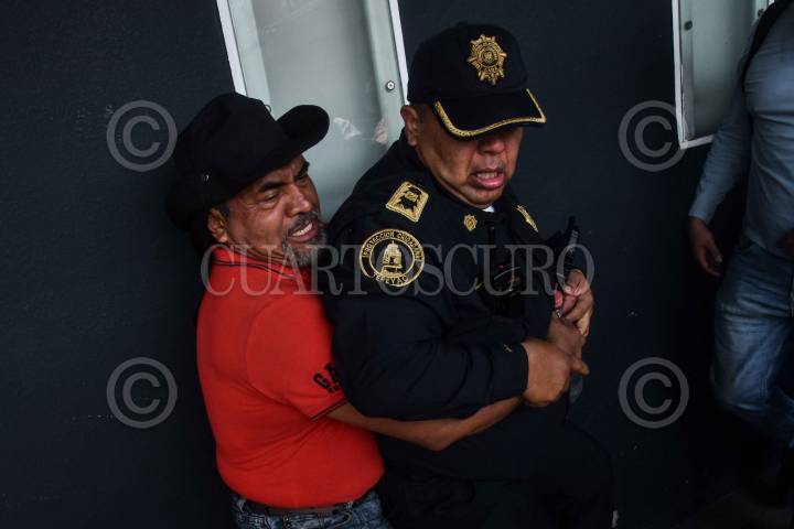 CIUDAD DE MÉXICO, 24MAYO2024.- Maestros de la Coordinadora Nacional de Trabajadores de la Educación (CNTE) realizaron una manifestación en la inmediaciones de la Terminal 1 del Aeropuerto Internacional de la Ciudad de México (AICM) en exigencia de un aumento salarial. El lugar fue resguardado por elementos de la Secretaria de Seguridad Ciudadana (SSC). En la imagen, un presunto maestro forcejea con un policía en su intento de ingresar a las instalaciones del Aeropuerto. FOTO: MARIO JASSO/CUARTOSCURO.COM
