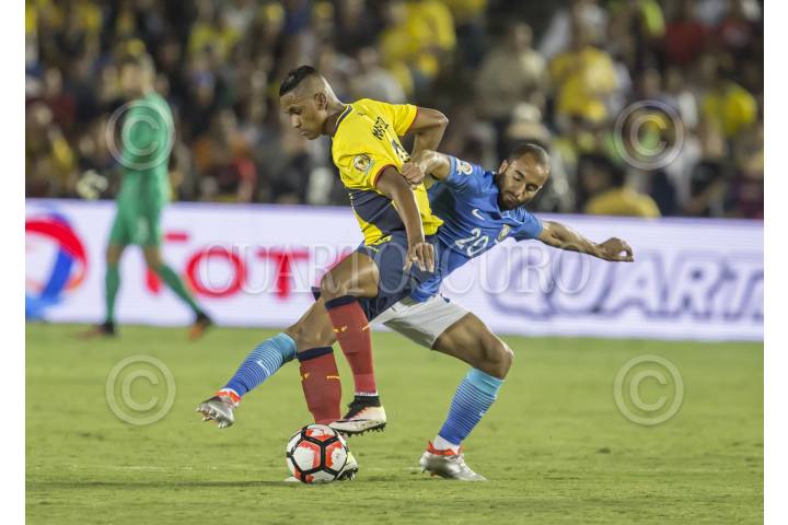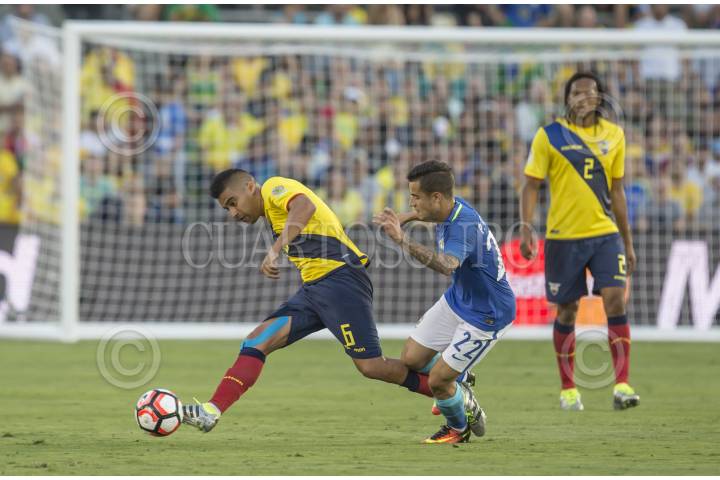 PASADENA, CALIFORNIA, 05JUNIO2016.- El día de ayer Christian Novoa disputa la bola con Philippe Coutinho durante el partido entre la selección de Brasil y su similar de Ecuador, realizado en el estadio Rose Bowl de Pasadena, California, correspendiente a la fase de grupos de la Copa América Centenario 2016. Marcador Final: Brasil 0, Ecuador. FOTO: CHRISTIAN SERNA /CUARTOSCURO.COM