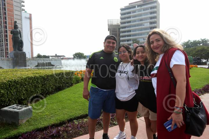 Una familia mexicana posa para la fotografía, esto en las inmediaciones de la Glorieta Minerva al finalizar el juego de la selección de México contra Polonia en el Mundial de Qatar 2022.