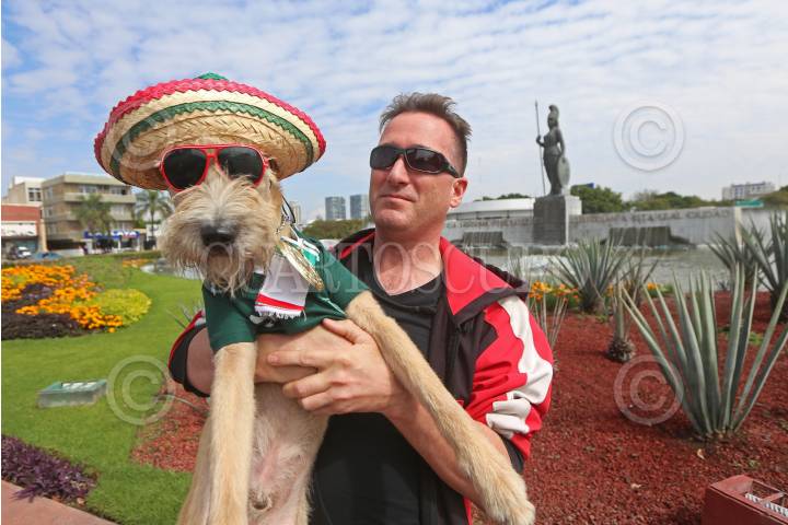 Un ciudadano canadiense que apoya a la selección mexicana posa junto a su mascota para la fotografía, esto en las inmediaciones de la Glorieta Minerva al finalizar el juego de la selección de México contra Polonia en el Mundial de Qatar 2022.