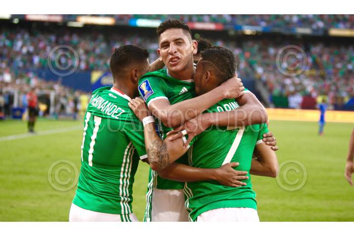 SAN DIEGO, CALIFORNIA, 09JULIO2017.- Acciones del partido de Selección Mexicana de fútbol ante su similar de El Salvador realizado en el estadio Qualcomm, correspondiente al grupo 1 de la Copa Oro, donde el marcador fue de 3-1 a favor de México. En la imagen, jugadores mexicanos festejan el tercer gol anotado por Orbelín Pineda. FOTO: CHRISTIAN SERNA/CUARTOSCURO.COM