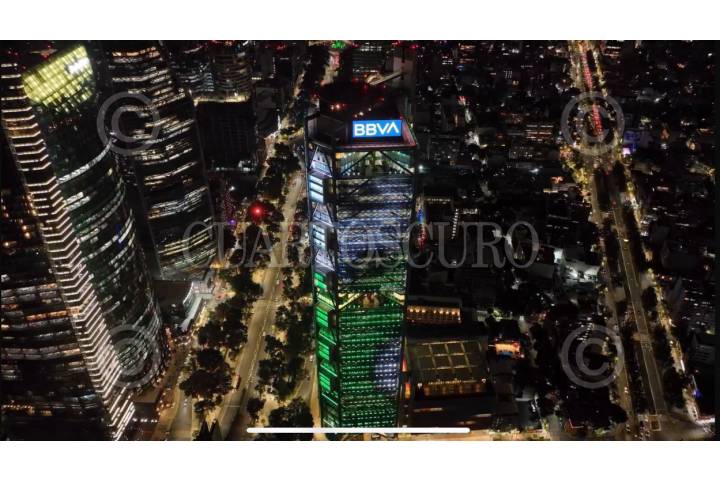 CIUDAD DE MÉXICO, 11JUNIO2025.- Encendido de edificios de color verde como cuenta regresiva a un año del inicio de la Copa del Mundo 2026, en donde México será sede de algunos partidos, como el juego inaugural. En la foto la torre BBVA. FOTO: GOBIERNO DE LA CIUDAD DE MÉXICO/CUARTOSCURO.COM