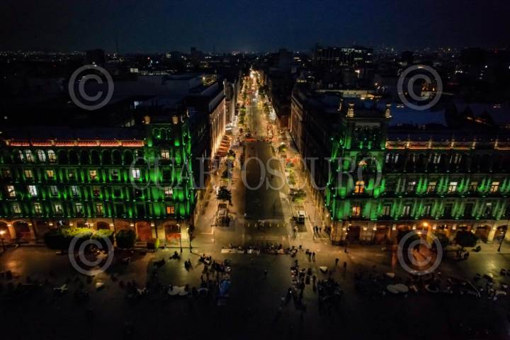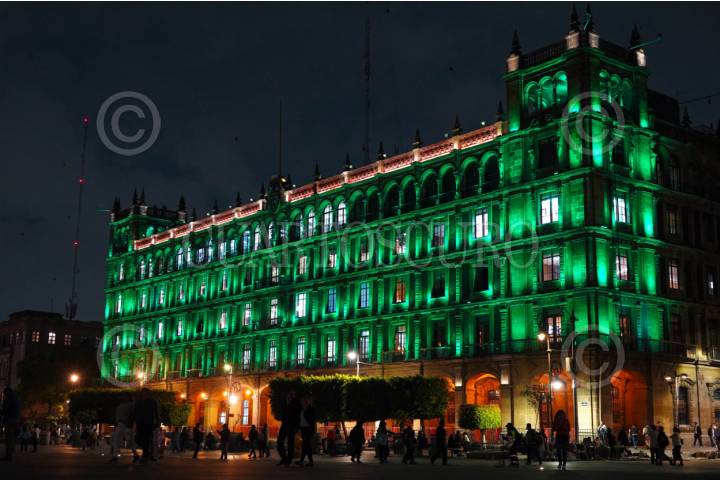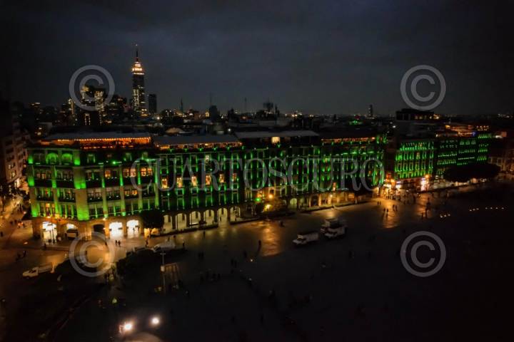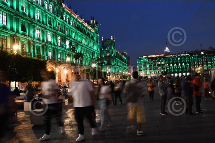CIUDAD DE MÉXICO, 11JUNIO2025.- Encendido de edificios de color verde como cuenta regresiva a un año del inicio de la Copa del Mundo 2026, en donde México será sede de algunos partidos, como el juego inaugural. En la foto edificios del Zócalo capitalino. FOTO: GOBIERNO DE LA CIUDAD DE MÉXICO/CUARTOSCURO.COM