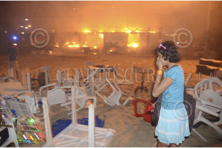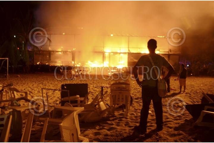 ACAPULCO, GUERRERO, 01ENERO2014.- El restaurante y discoteca el Copacabana, ubicado en la zona Tradicional del puerto junto a la Vía Rápida, se incendió totalmente en menos de 45 minutos. Las llamas comenzaron aproximadamente en el establecimiento a las 22:30 horas, causando la sorpresa de miles de turistas apostados en las playas de Acapulco mientras esperaban la llegada del año nuevo. En el lugar había unos 100 comensales, que escaparon por la parte de la playa. El gobierno municipal informó que no se registraron heridos, no obstante lo aparatoso del siniestro, debido a las enramadas que cubrían el techo del lugar. Al parecer un cohete mal manejado produjo el fuego, aunque otra versión señala que hombres armados prendieron fuego con gasolina por la parte de enfrente. Al lugar se desplazaron elementos de bomberos, protección civil municipal y estatal, que controlaron el siniestro alrededor de las 23:30 horas. FOTO: BERNANDINO HERNÁNDEZ /CUARTOSCURO.COM