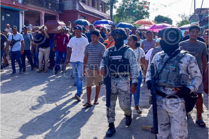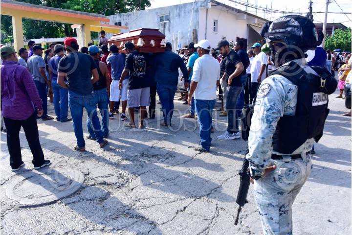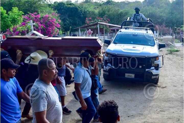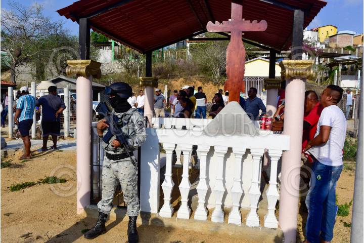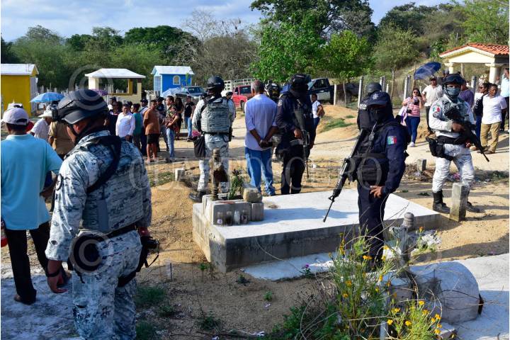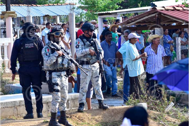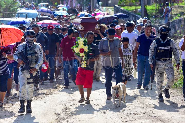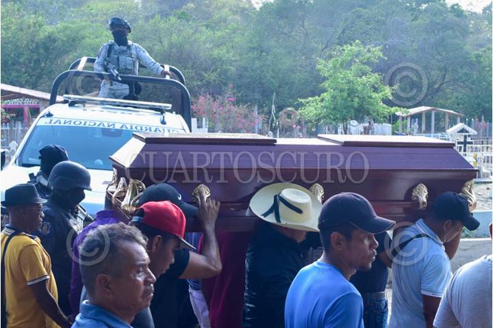 COPALA, GUERRERO, 18JUNIO2024.- Con un fuerte operativo de seguridad fue sepultado Salvador Villalba Flores, el alcalde electo del municipio de Copala, ubicado en la región de la Costa Chica de Guerrero, Villalba Flores resultó ganador en las pasadas elecciones del 2 de junio como candidato del partido México Avanza, y fue asesinado por un grupo de hombres armados que interceptaron el autobús en el que viajaba desde la Ciudad de México el lunes por la madrugada, durante el cortejo fúnebre hacia el panteón familiares, amigos y simpatizantes gritaron la consigna Justicia!! Justicia!! Varias veces. FOTO: CARLOS ALBERTO CARBAJAL/CUARTOSCURO.COM