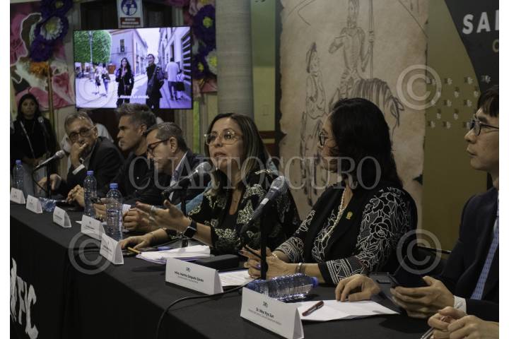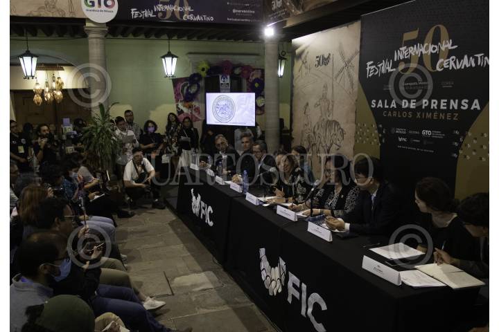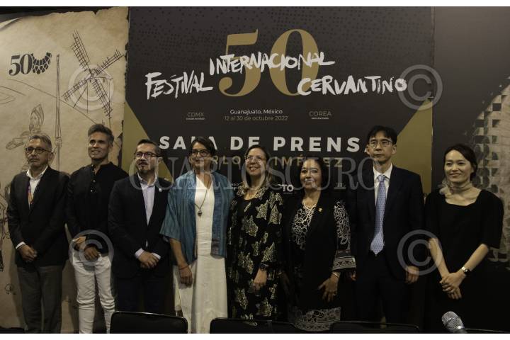 Ángel Acona, director del Sistema de teatros CDMX; Jorge Cabrejos, director de Mercadotecnia de la Secretaria de Turismo del Estado de Guanajuato; José Osvaldo Chávez, director de Extensión Cultural de la UG; Adriana Camarena de Obeso, directora General del IEC Guanajuato; Mariana Aymerich Ordóñez, directora general del Festival Internacional Cervantino (FIC); Martha Delgado Zárate, secretaria del H. Ayuntamiento; Woo Pyo Jun, director del Centro Cultural Coreano en México; Yeakoo, team leader de Kofice durante la conferencia de cierre del Festival Internacional Cervantino (FIC) en su cincuenta edición que tuvo como país invitado a Corea y a Ciudad de México como Ciudad invitada. No se anuncio invitado para el próximo año aún.