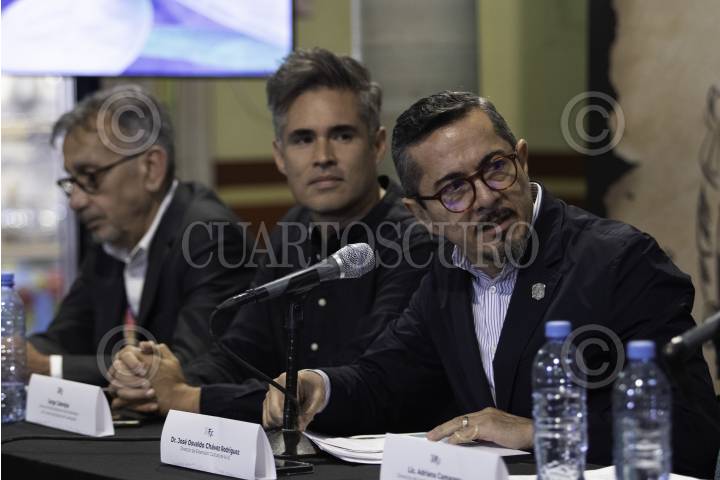 Ángel Acona, director del Sistema de teatros CDMX; Jorge Cabrejos, director de Mercadotecnia de la Secretaria de Turismo del Estado de Guanajuato; José Osvaldo Chávez, director de Extensión Cultural de la UG; Adriana Camarena de Obeso, directora General del IEC Guanajuato durante la conferencia de cierre del Festival Internacional Cervantino (FIC) en su cincuenta edición que tuvo como país invitado a Corea y a Ciudad de México como Ciudad invitada. No se anuncio invitado para el próximo año aún.