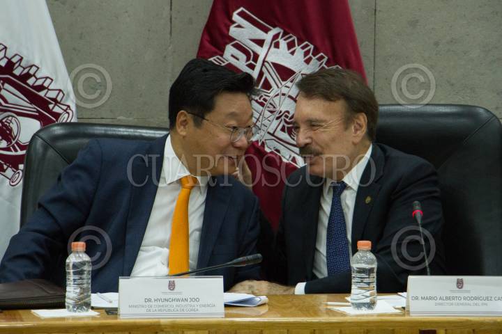 CIUDAD DE MÉXICO, 03JUNIO2019.- Hyunghwan Joo, Ministro de Comercio Industrial y Energía de la República de Corea y Mario Alberto Rodríguez Casas, Director General del IPN; encabezaron la presentación del Informe Final del Programa de Conocimiento Compartido con México (Knowledge Sharing Program –KSP–) de la República de Corea del Sur y el IPN en la sala de del Consejo General Consultivo de la Unidad Profesional Adolfo López Mateos. FOTO: ROGELIO MORALES /CUARTOSCURO.COM