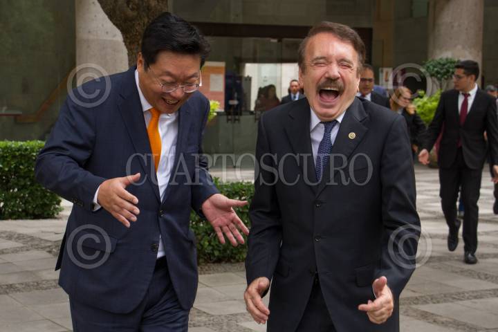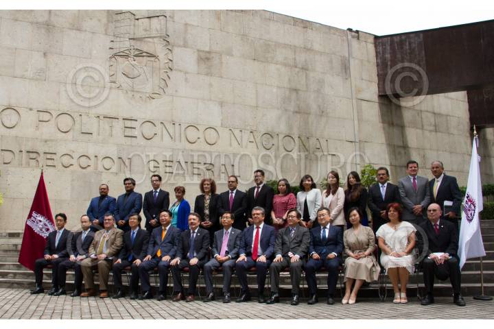 CIUDAD DE MÉXICO, 03JUNIO2019.- Hyunghwan Joo, Ministro de Comercio Industrial y Energía de la República de Corea y Mario Alberto Rodríguez Casas, Director General del IPN; durante la foto oficial de la presentación del Informe Final del Programa de Conocimiento Compartido con México (Knowledge Sharing Program –KSP–) de la República de Corea del Sur y el IPN en la sala de del Consejo General Consultivo de la unidad profesional Adolfo López Mateos. FOTO: ROGELIO MORALES /CUARTOSCURO.COM