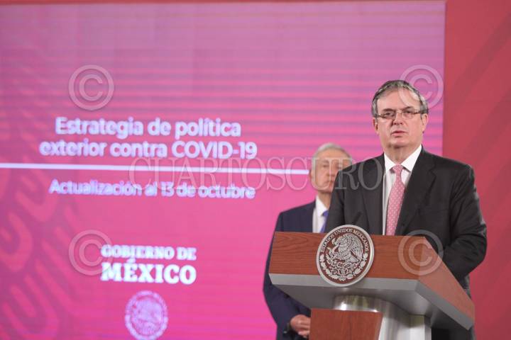 Andrés Manuel López Obrador, presidente de México acompañado de Marcelo Ebrard, secretario de Relaciones Exteriores, durante la conferencia matutina en Palacio Nacional