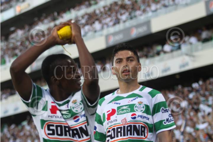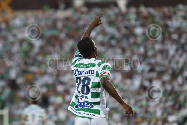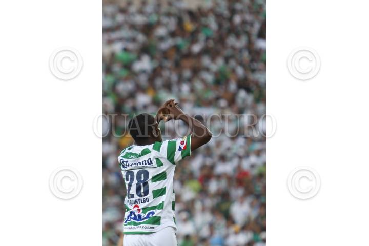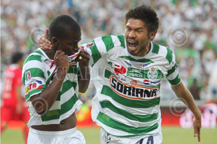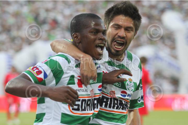 TORREON, COAHUILA, 20MAYO2010.- Darwin Quintero de los guerreros del Santos Laguna festeja su anotación en contra de los Diablos del Toluca en el partido de ida de la final del torneo Bicentenario del fútbol mexicano que se realiza en el estadio Corona. El partido hasta este momento del primero tiempo va empatado a un gol. FOTO: RODOLFO ANGULO/CUARTOSCURO.COM