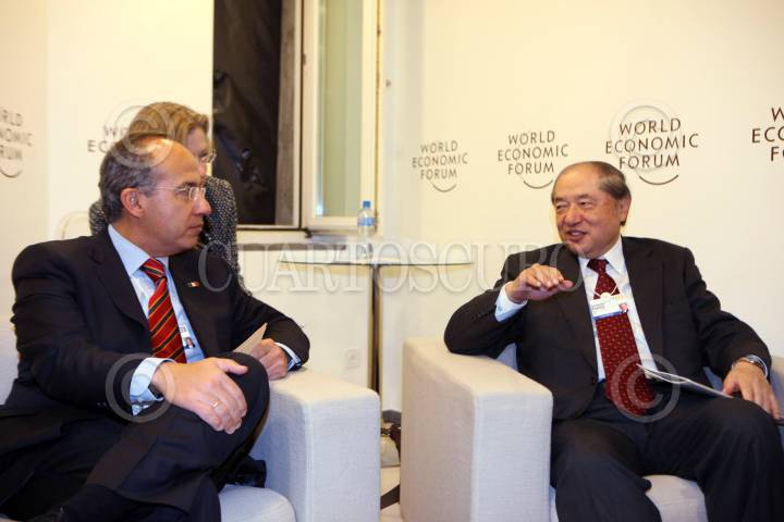 DAVOS, SUIZA, 28ENERO2011.- Felipe Calderón, presidente de los Estados Unidos Mexicanos, sostuvó un encuentro con Yorihiko Kojima, ejecutivo de Mitsubishi Corporation, en el Centro de Congresos en donde se realiza el Foro Mundial Económico. FOTO: ALFREDO GUERRERO/CUARTOSCURO.COM