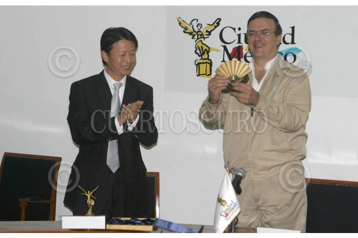 MÉXICO D.F. 02ABRIL2007.- Zaisheng Wei vicepresidente de la compañia china ZTE Corporation y el Jefe de gobierno Marcelo Ebrard recibe un presente del funcionario chino al termino de la firma de convenio de para instalar internet inalambrico en escuelas y dependencias de gobierno. FOTO: SAUL LÓPEZ/CUARTOSCURO.COM