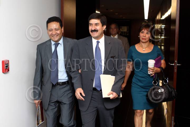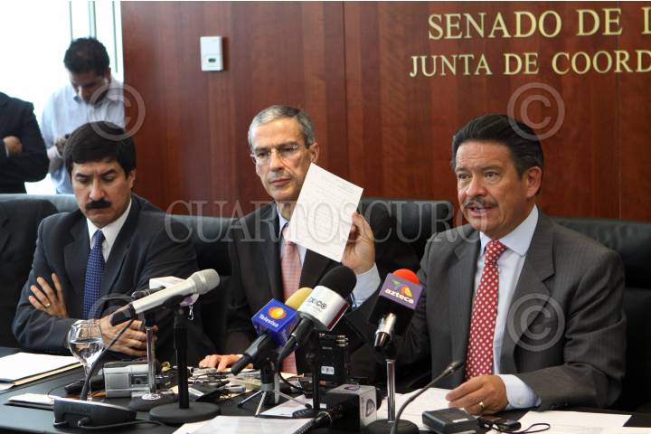 MÉXICO, D.F., 05AGOSTO2011.- El diputado Javier Corral y los senadores José Gonzalez Morfin, Jesús Murillo Karam y Tomas Torres durante una conferencia de prensa al termino de una reunión en donde hablaron sobre el proceso de dictaminación de la Ley de Seguridad Nacional que se realizo en instalaciones del Senado de la República. FOTO: RODOLFO ANGULO/CUARTOSCURO.COM