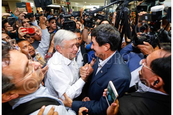 CIUDAD JUÁREZ, CHIHUAHUA, 06AGOSTO2018.- Andrés Manuel López Obrador, presidente electo de México, fue recibido por el gobernador Javier Corral a su llegada a la ciudad, debido a que mañana encabezará el arranque de los foros por la pacificación. FOTO: NACHO RUIZ /CUARTOSCURO.COM