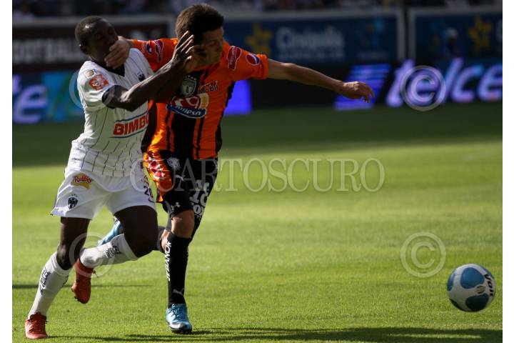 PACHUCA, PACHUCA, 01MAYO2010.- José Francisco Torres de los Tuzos del Pachuca corre con el balón mientras le tapa la cara a Walter Ayovi de los Rayados del Monterrey en el partido de ida de cuartos de final del Torneo Bicentenario que se realizo en esta ciudad. Los Tuzos ganaron 1 gol por 0 a los Rayados. FOTO: RODOLFO ANGULO/CUARTOSCURO.COM