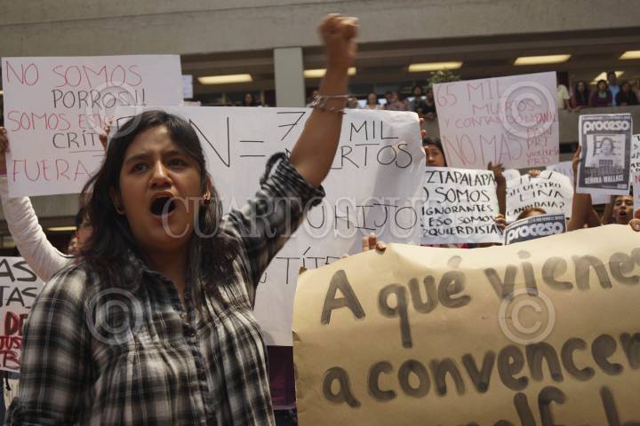 MÉXICO, D.F., 06JUNIO2012.- Isabel Miranda de Wallace, candidata a la Jefatura de Gobierno del Distrito Federal por el Partido Acción Nacional, interrumpió la conferencia que realizaba ante los estudiantes de la UAM campus Iztapalapa, y tuvo que salir corriendo a su vehículo, por la puerta trasera, del edificio F de esta institución, debido a que los estudiantes gritaban en su contra y reclamaban su presencia en la UAM. En la foto un estudiante grita a la candidata. FOTO: PEDRO ANZA /CUARTOSCURO.COM