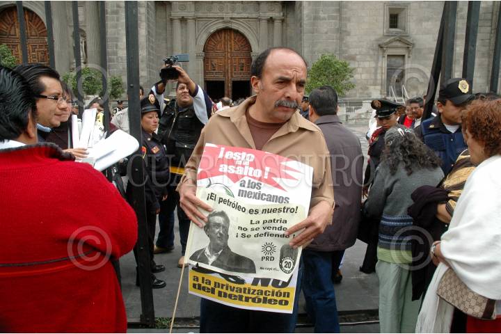 MÉXICO, D.F., 13ABRIL2008.- Un seguidor de Andres Manuel Lopéz Obrador con pancartas se pone enfrente de uno de los accesos de la Catedral Metropolitana sin que se suscitaran enfrentamientos al filo de este medio día. FOTO:RODOLFO ANGULO /CUARTOSCURO.COM
