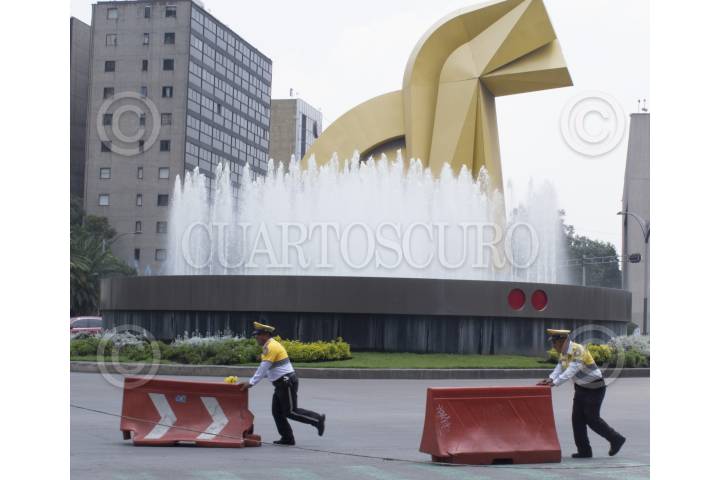 MÉXICO, D.F., 12JUNIO2014.- Policías de transito empujan las bollas para los cortes de circulación sobre avenida Reforma y Juárez, en el primer cuadro de la ciudad se vivieron varias marchas que complicaron la circulación. FOTO: MOISÉS PABLO /CUARTOSCURO.COM