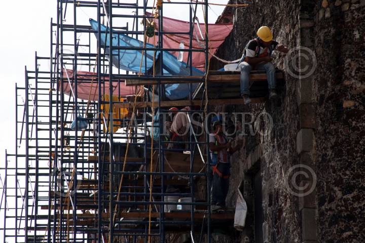 CUERNAVACA, MORELOS, 11SEPTIEMBRE2018.- Trabajadores bajo la inspección de Instituto Nacional de Historia y Antropología realizan labores de reconstrucción del Palacio de Cortes, afectado por el sismo del pasado 19 de septiembre del 2017. FOTO: MARGARITO PÉREZ RETANA /CUARTOSCURO.COM