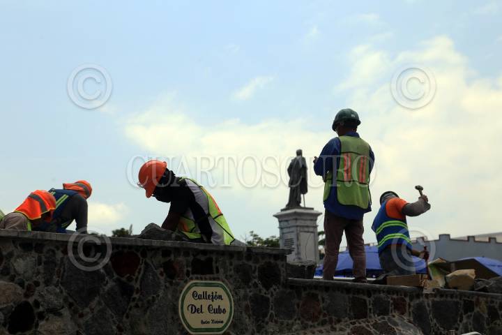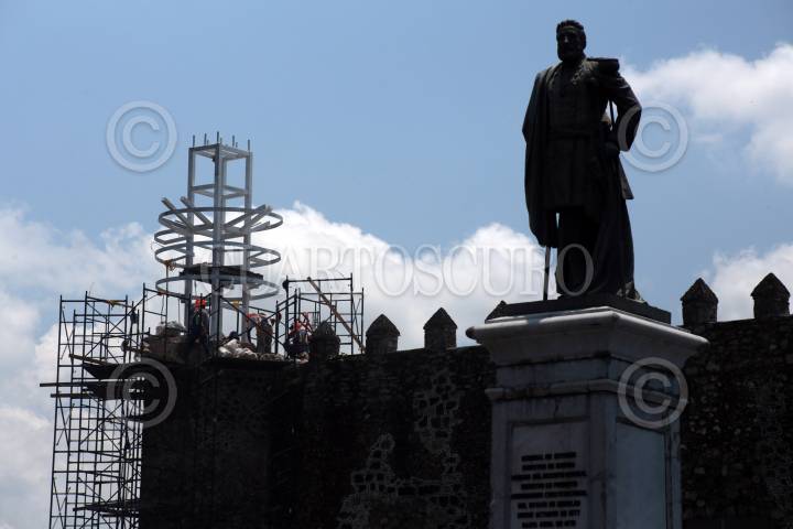 CUERNAVACA, MORELOS, 19SEPTIEMBRE2018.- Albañiles bajo la tutela de especialistas del Instituto Nacional de Antropología e Historia, trabajan en la reconstrucción del Palacio de Cortes, a un año del sismo que lo afecto, al fondo la estatua de Carlos Pacheco, gobernador porfirista de Morelos. FOTO: MARGARITO PÉREZ RETANA /CUARTOSCURO.COM