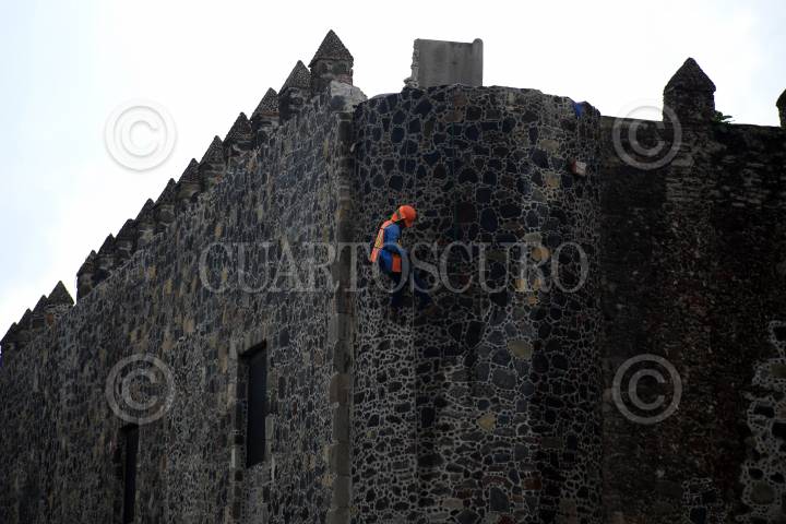 CUERNAVACA, MORELOS, 19JUNIO2018.- Bajo la supervisión del Instituto Nacional de Antropología e Historia, albañiles trabajan en la remediación del Palacio de Cortes, el cual resulto afectado por el sismo del pasado mes de septiembre. FOTO: MARGARITO PÉREZ RETANA /CUARTOSCURO.COM