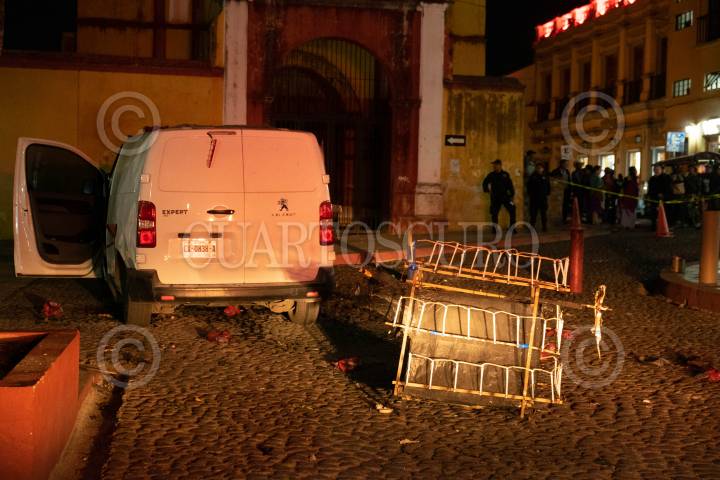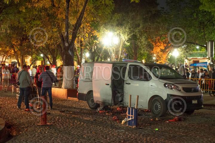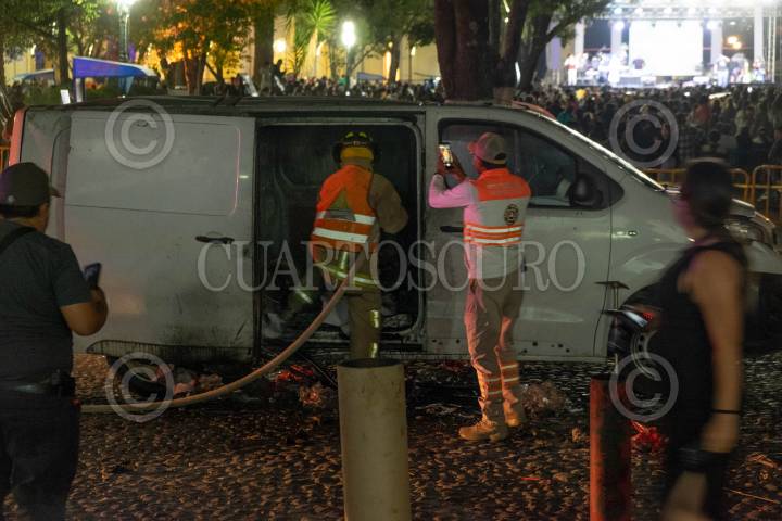 SAN CRISTOBAL DE LAS CASAS, CHIAPAS, 29MAYO2024.- La camioneta que transportaba la pirotecnia que sería usada para el cierre de campaña de la candidata a presidenta municipal Fabiola Ricci del partido Morena, se incendió en pleno evento, autoridades de Protección Civil, Cuerpo de Bomberos, Fiscalía y Sedena acudieron al lugar, se reportaron 2 personas con ataque de pánico y ningún fallecido. El evento de la candidata continuó mientras se atendía el suceso. FOTO: ISABEL MATEOS /CUARTOSCURO.COM