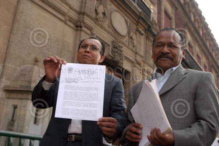 MÉXICO, D.F. 09ENERO2006.- Los diputados perredistas Alejandro Sánchez Camacho y Balfre Vargas Cortez muestran frente a palacio nacional la carta dirigida al secretario de Hacienda Agustin Carstens para que especifiquen los programas aprobados y discutidos de las partidas presupuestales de egresos del 2007. FOTO: SAÚL LÓPEZ/CUARTOSCURO.COM