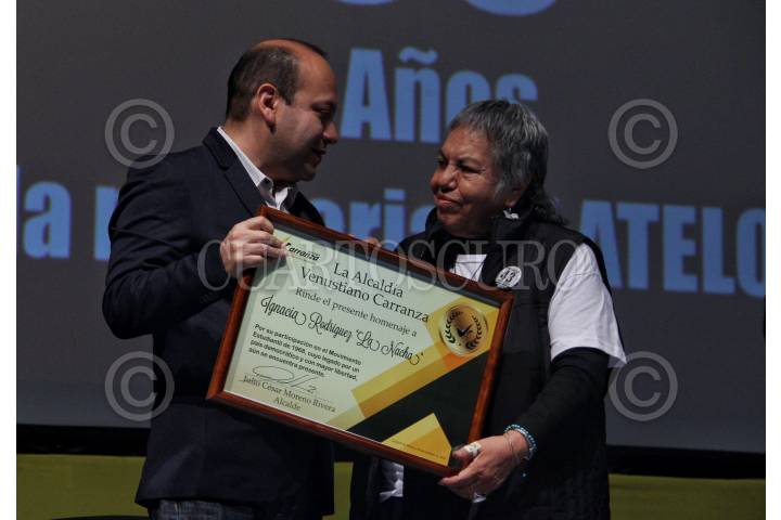 CIUDAD DE MÉXICO, 05OCTUBRE2018.- El centro cultural de la delegación Venustiano Carranza se convirtió en la cede del festival Octubre Negro, en la que, en esta edición se dedicó a los 50 años del movimiento estudiantil del 68, ofreciendo reconocimiento a Ignacia Rodriguez Márquez, alias “La Nacha Rodríguez”, sobreviviente del comité 68. El evento presidió Ricardo González, organizador del festival y Julio César Moreno, alcalde de la delegación. Octubre Negro tendrá muestras de cine, música, literatura que terminará hasta el 03 noviembre del año en curso. FOTO: ANDREA MURCIA /CUARTOSCURO.COM