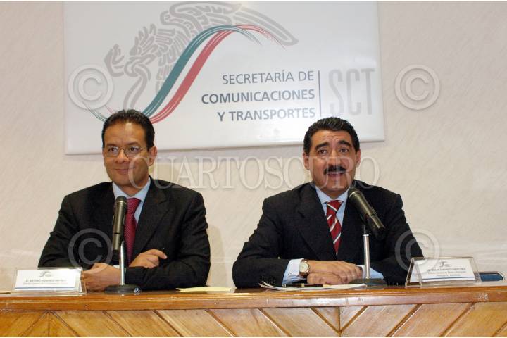 MEXICO, D.F. 20JULIO2005.- Antonio Alvarado Briones, director general de Comunicación Social y Oscar Santiago Corzo Cruz, director general de tarifas y Transporte ferroviarrio y multimodal, ofrecierón una conferencia de prensa sobre el tren suburbano. FOTO: Osvaldo Aguilar/CUARTOSCURO.COM