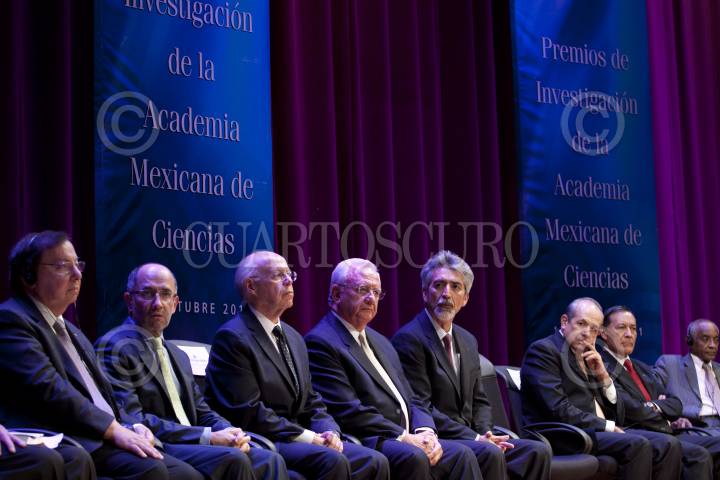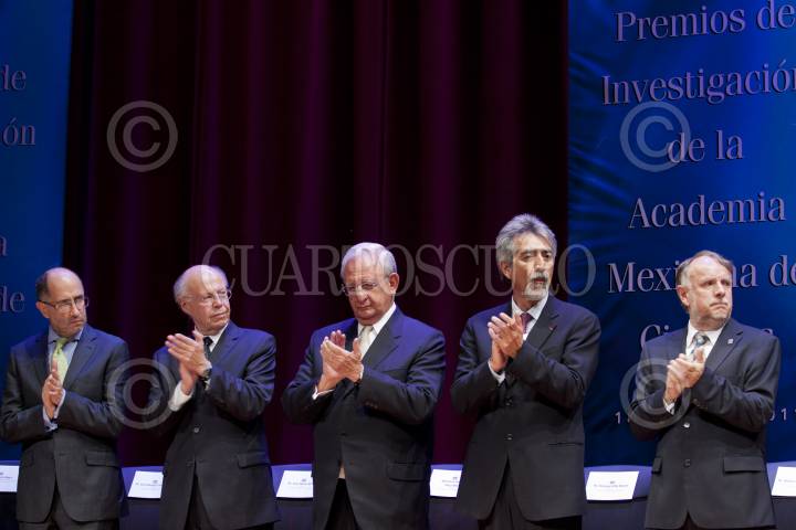 MÉXICO, D.F., 18OCTUBRE2011.- José Ramón Cossío Díaz, ministro, José Narro Robles, rector de la UNAM, Juan N. Silva Meza, ministro presidente de la Suprema Corte de Justicia de la Nación, Enrique Villa Rivero, director del Conacyt, Arturo Menchaca Rocha, director de la Academia Mexicana de Ciencias, encabezaron la premiación de la academia a los veinte investigadores galardonados por su trabajo en las categorías de Ciencias Sociales, Humanidades, Ciencias Naturales, Ingeniería y Tecnologías, y Ciencias Exactas. Este premio no se entregaba desde el año 2008. FOTO: MOISÉS PABLO/CUARTOSCURO.COM