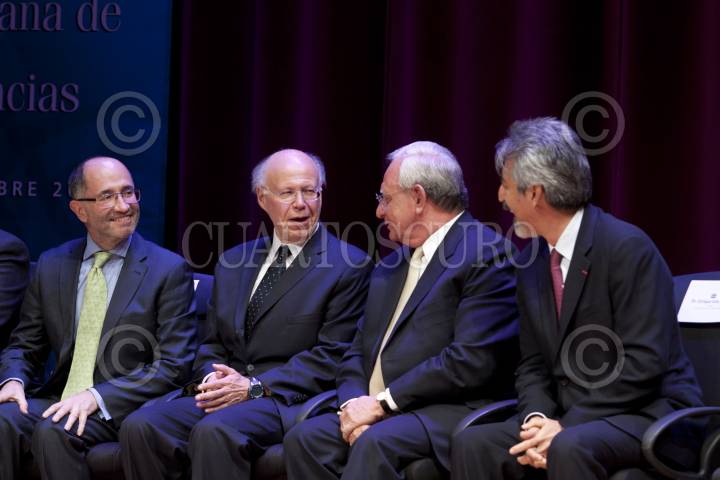 MÉXICO, D.F., 18OCTUBRE2011.- José Ramón Cossío Díaz, ministro, José Narro Robles, rector de la UNAM, Juan N. Silva Meza, ministro presidente de la Suprema Corte de Justicia de la Nación, y Enrique Villa Rivero, director del Conacyt, durante la ceremonia en la que la Academia Mexicana de Ciencias le entregó reconocimientos a los investigadores galardonados en las categorías como Ciencias Sociales, Humanidades, Ciencias Naturales, Ingeniería y Tecnologías, y Ciencias Exacta. Eeste premio no se entregaba desde el año 2008. FOTO: MOISÉS PABLO/CUARTOSCURO.COM