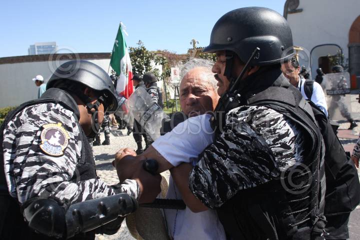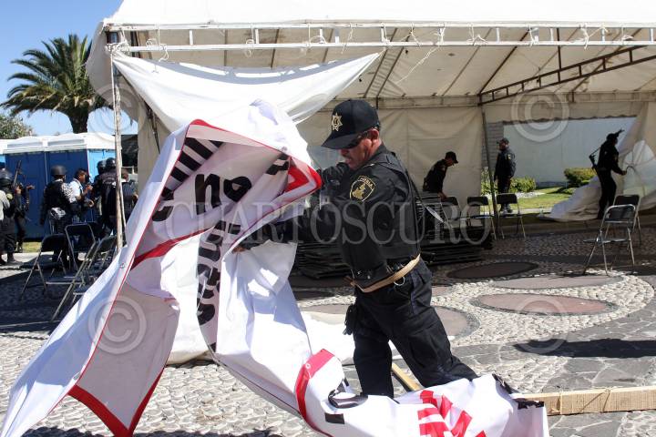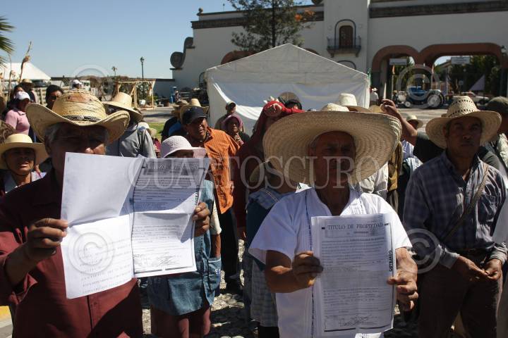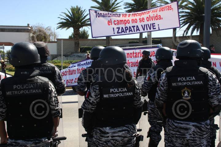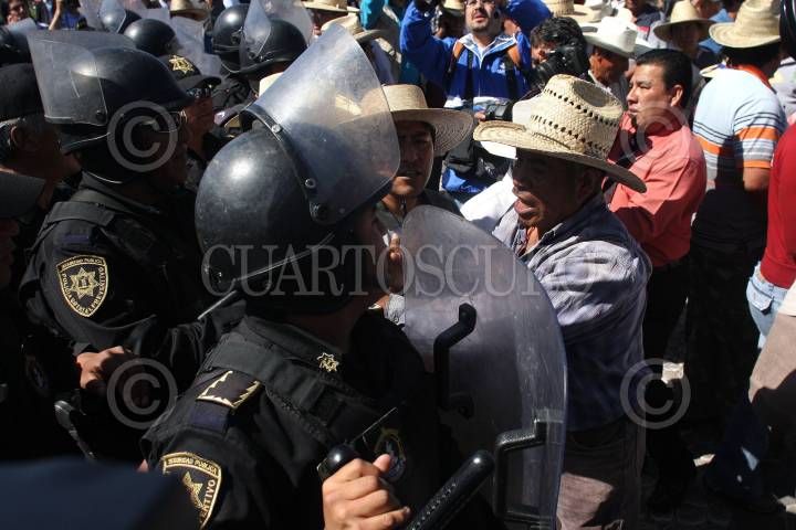 SAN ANDRÉS CHOLULA, PUEBLA, 25ENERO2011.- Campesinos de la región de Santa María Tonanzintla, fueron desalojados por granaderos de la policía Metropolitana y Policía Estatal, mientras se manifestaban bloqueando el acceso al exclusivo fraccionamiento La Vista Country Club. Los quejosos acusaron al gobernador Mario Marín por la presunta venta de los terrenos con documentación falsa. FOTO: FRANCISCO GUASCO/CUARTOSCURO.COM
