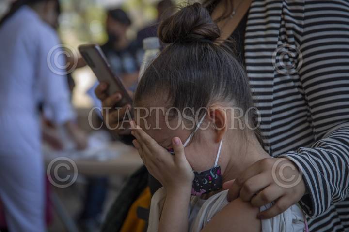 Dos niños miran con atención a su madre, mientras personal médico le toma la muestra nasal para la prueba rápida de COVID-19.