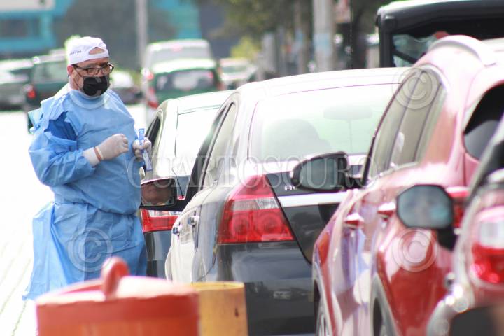 Ciudadanos de Nuevo León se forman en sus automóviles para realizarse la prueba para detectar el Covid-19, tras dispararse los casos de hospitalizaciones por esta enfermedad.