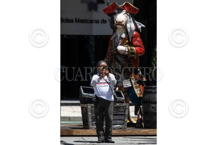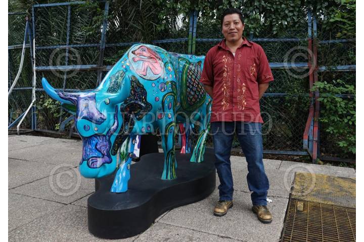 El artista Filogonio junto con el diseño de un toro de Cow Parade 2023, instalados en Paseo de la Reforma