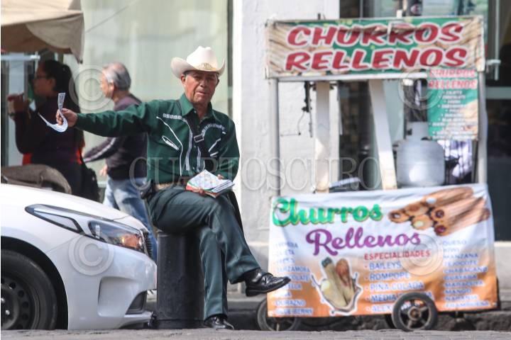 Hombre descansa sobre una barra peatonal, mientras ofrece boletos de lotería, en el centro de Coyoacán.