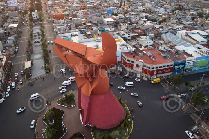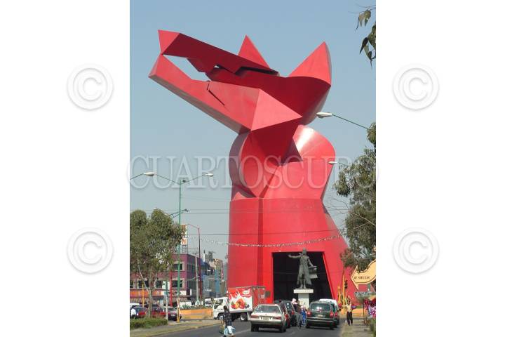 NEZAHUALCÓYOTL, EDO. DE MÉXICO, 03ABRIL2009.- La obra escultórica denominada "Cabeza de Coyote" del artista Sebastián, de 40 metros de altura y un peso de 298 toneladas. Es considerada una de las obras más grandes no sólo del estado de México sino del país y de América Latina. Se localiza en la glorieta que forman las avenidas Adolfo López Mateos y Pantitlán, se distingue desde una distancia de más de dos kilómetros a la redonda. “Cabeza de Coyote” se inició en el 2005 con una inversión de dos millones de pesos y estaba proyectada para concluirse en un año, pero fue hasta el 23 de abril 2008 cuando se inauguró. FOTO: MARIO NULO/MARIO NULO/CUARTOSCURO.COM