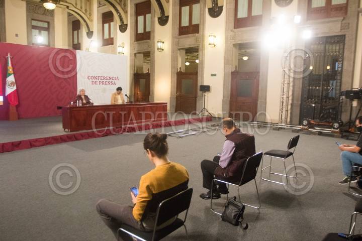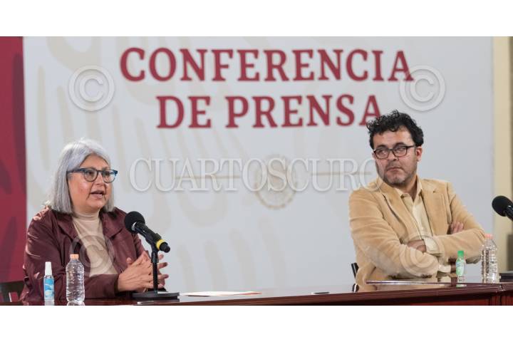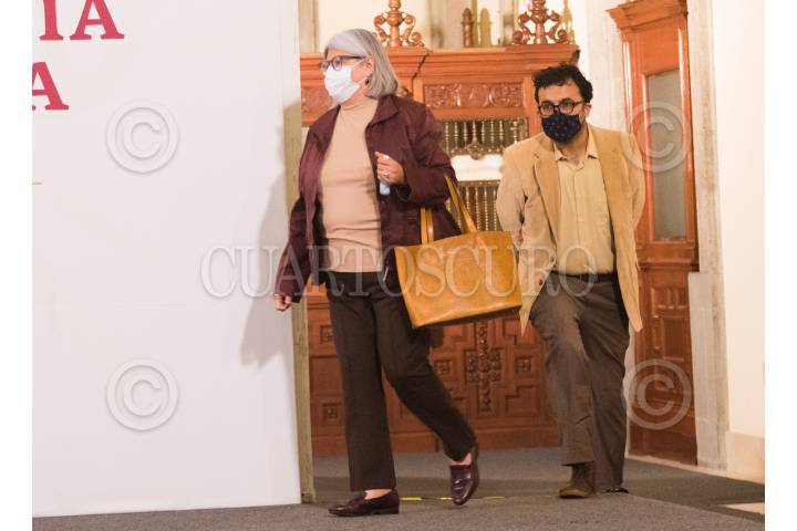 Graciela Márquez, Secretaria de Economía en la conferencia de prensa esta tarde, en el salón tesorería de Palacio Nacional. La acompaña un funcionario de Hacienda.