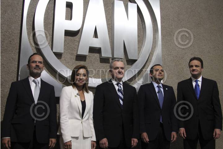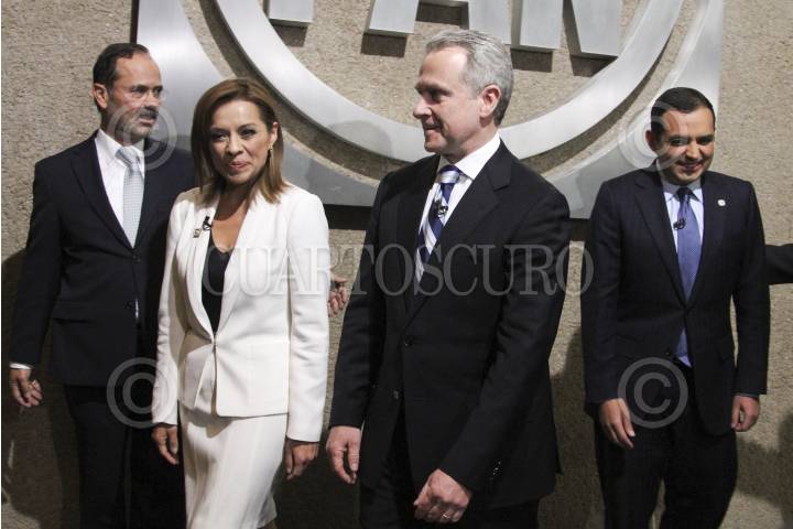 MÉXICO, D.F., 31ENERO2012.- Gustavo Madero, dirigente del PAN, y los precandidatos a la Presidencia de la República; Josefina Vázquez Mota, Santiago Creel Miranda y Ernesto Cordero Arroyo. En la sede nacional del blanquiazul se realizó el segundo debate con miras a la elección interna del PAN del próximo domingo en donde se definirá a su candidato presidencial. FOTO: ENRIQUE ORDÓÑEZ/CUARTOSCURO.COM